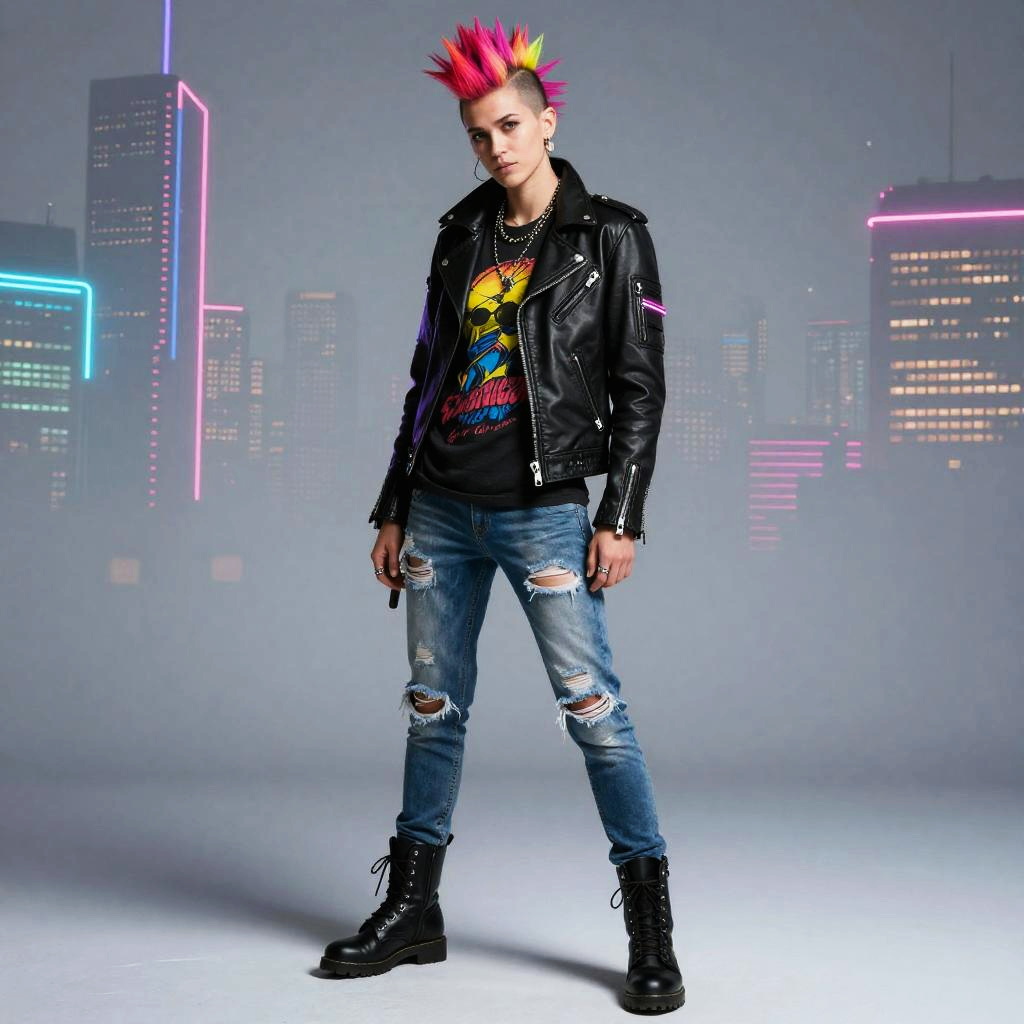 Image in the style of Cyberpunk 2077, rebellious computer science student, bright colored mohawk, slim build, nerd outfit, leather jacket, graphic tee, ripped jeans, and combat boots, Neon cityscape studio background