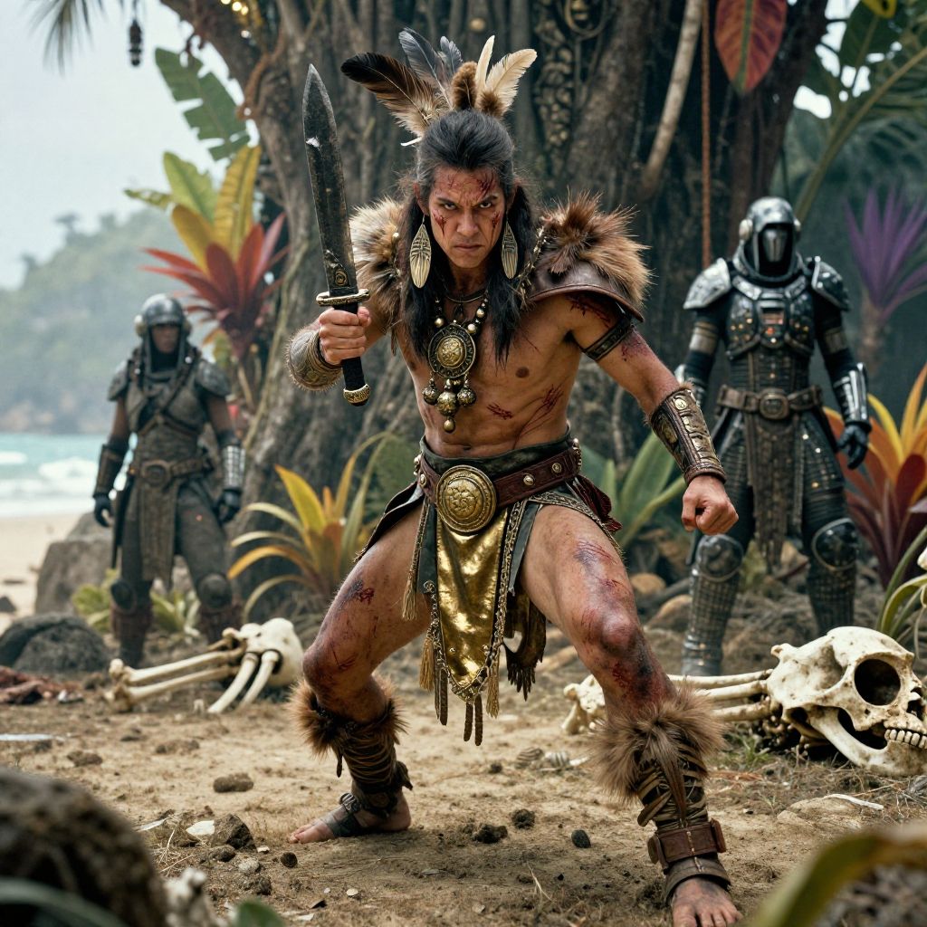 Photograph of a muscular, indigenous warrior in a forest clearing, dressed in tribal armor with fur accents, feathers, and a golden loincloth. He holds a black dagger in a ready stance, with intense focus. His skin is smeared with red paint. Two armored, futuristic soldiers in black gear stand behind him, one to the left and one to the right. The background features tall trees, tropical plants, a beach, and scattered bones. The scene is dynamic, blending primitive and modern elements, with vivid colors and sharp contrasts.
