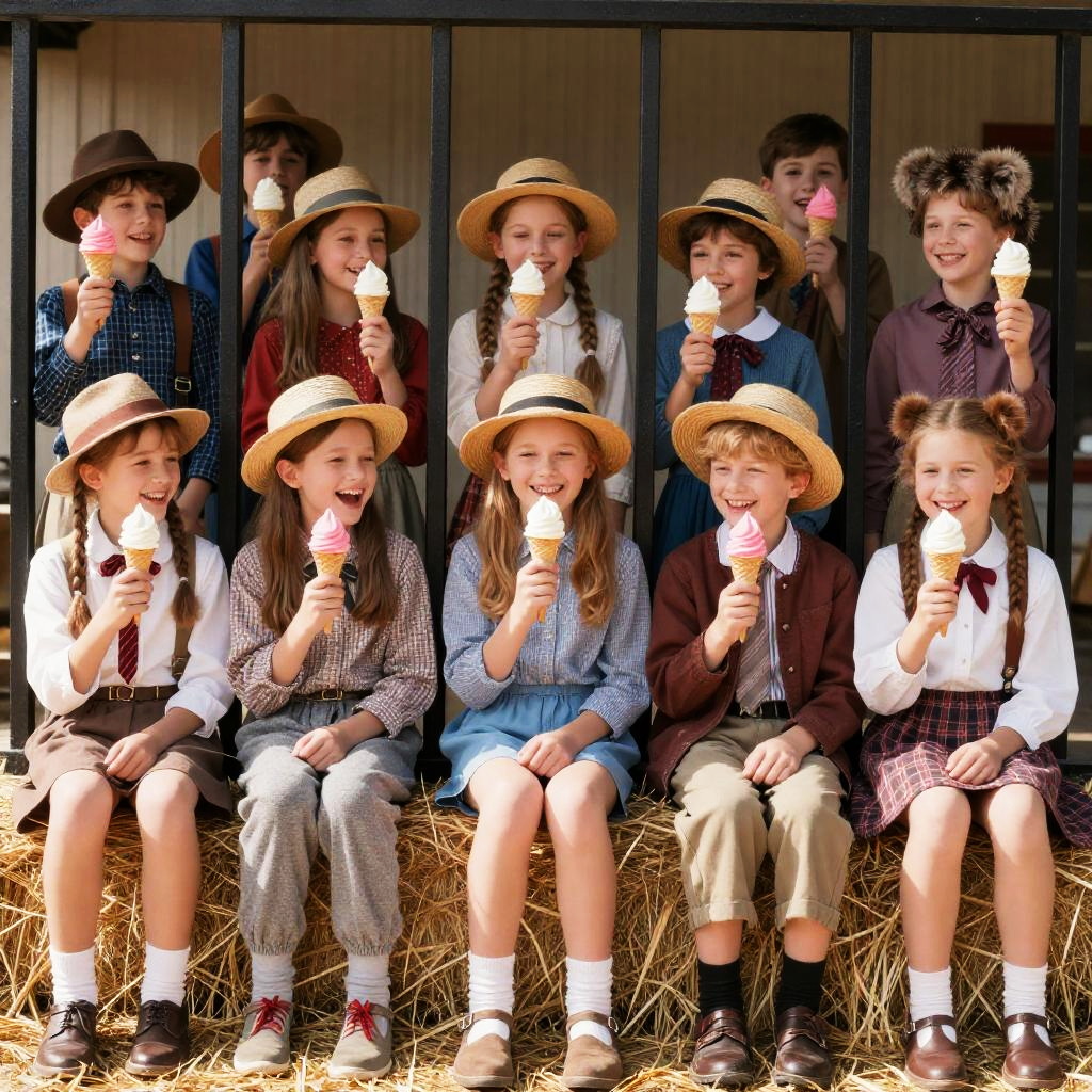 Twelve children dressed in vintage-style clothing and hats, sitting and standing behind black metal bars. They are holding pink and white ice cream cones while smiling and laughing. The ground is covered with hay, and the scene is set outdoors in sunlight. Some children wear fur headbands and suspenders, adding to the nostalgic feel of the image.