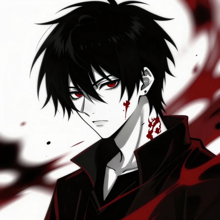 Black and red anime character portrait focusing on a brooding anti-hero with black spiky hair and blood red tattoos, intense gaze, minimalist background with abstract red and black patterns, strong use of shadow and highlights to create dramatic mood and depth.