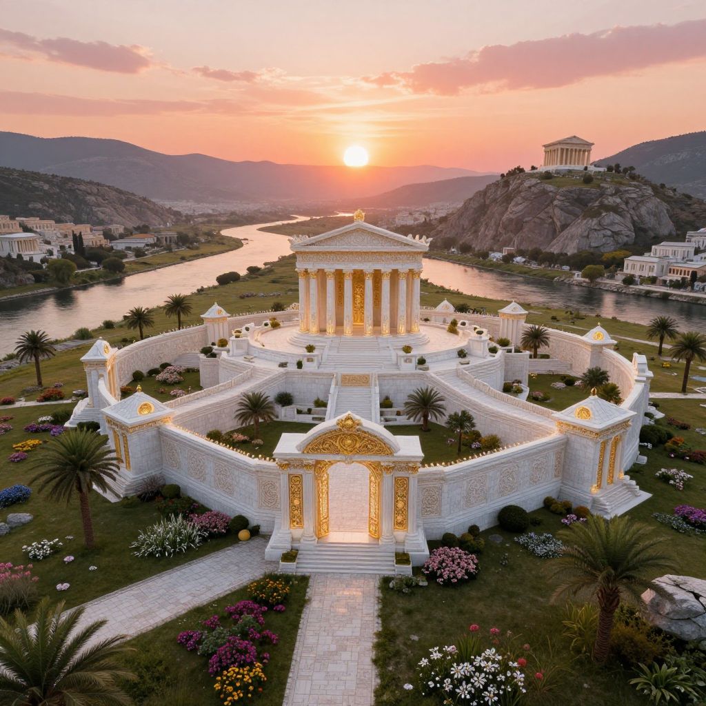 Wide view, High angle bird eyes view, ultra-realistic cinematic scene, set on a serene riverside grassland interspersed with flowers and date palm trees under a stunning sunset orange-pink hue lighting, A Massive Greek mountain city Complex, crafted from pristine white stone, rises against the natural beauty, Its architecture is inspired by Ancient Greek styles, featuring golden decorative elements, intricate ornate gates, and elaborately carved walls, seamlessly blending antiquity with fantastical elegance, The surrounding grasslands and vibrant flower fields, dotted with scattered plants, add bursts of life to the composition, Far in the background, the Mountainsscape and iconic Greek Temple emerge under the fading light, grounding the fantastical scene in a sense of historical wonder, A soft halo lighting accentuates details, complemented by subtle ambient occlusion for depth, while whimsical and fantastical touches evoke a dreamlike quality, This maximalist splash art composition, rendered in photorealistic textures with sharp focus, balances tranquility with grandeur, Inspired by liiv1, linquivera, and mentixis, the design integrates cinematic realism and award-winning concept art techniques, harmonizing nature, architecture, and a glowing, mysterious aura to evoke immersive storytelling through timeless beauty