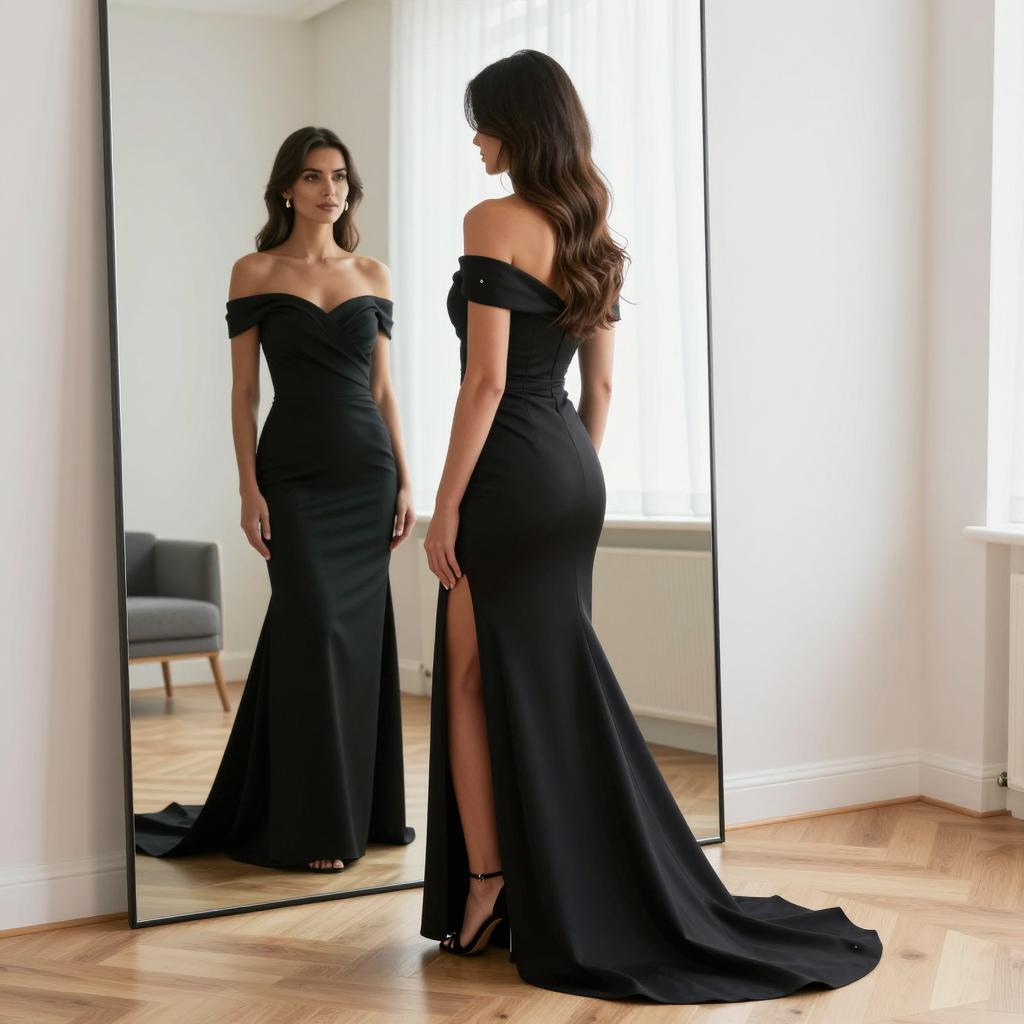 A woman with long wavy dark hair wearing a sleek, off-the-shoulder black evening gown featuring a high slit and long train, stands gracefully in front of a large floor mirror. The minimalist room with natural light, light wooden floors, and neutral decor highlights the modern, sophisticated style of the outfit and setting.