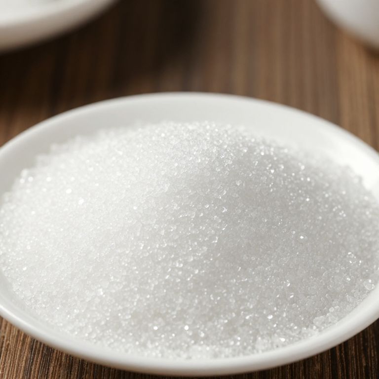 Close-up image of white granulated sugar piled in a white ceramic bowl on a wooden surface. The sugar crystals are clearly visible, showcasing their fine texture and sparkling appearance.