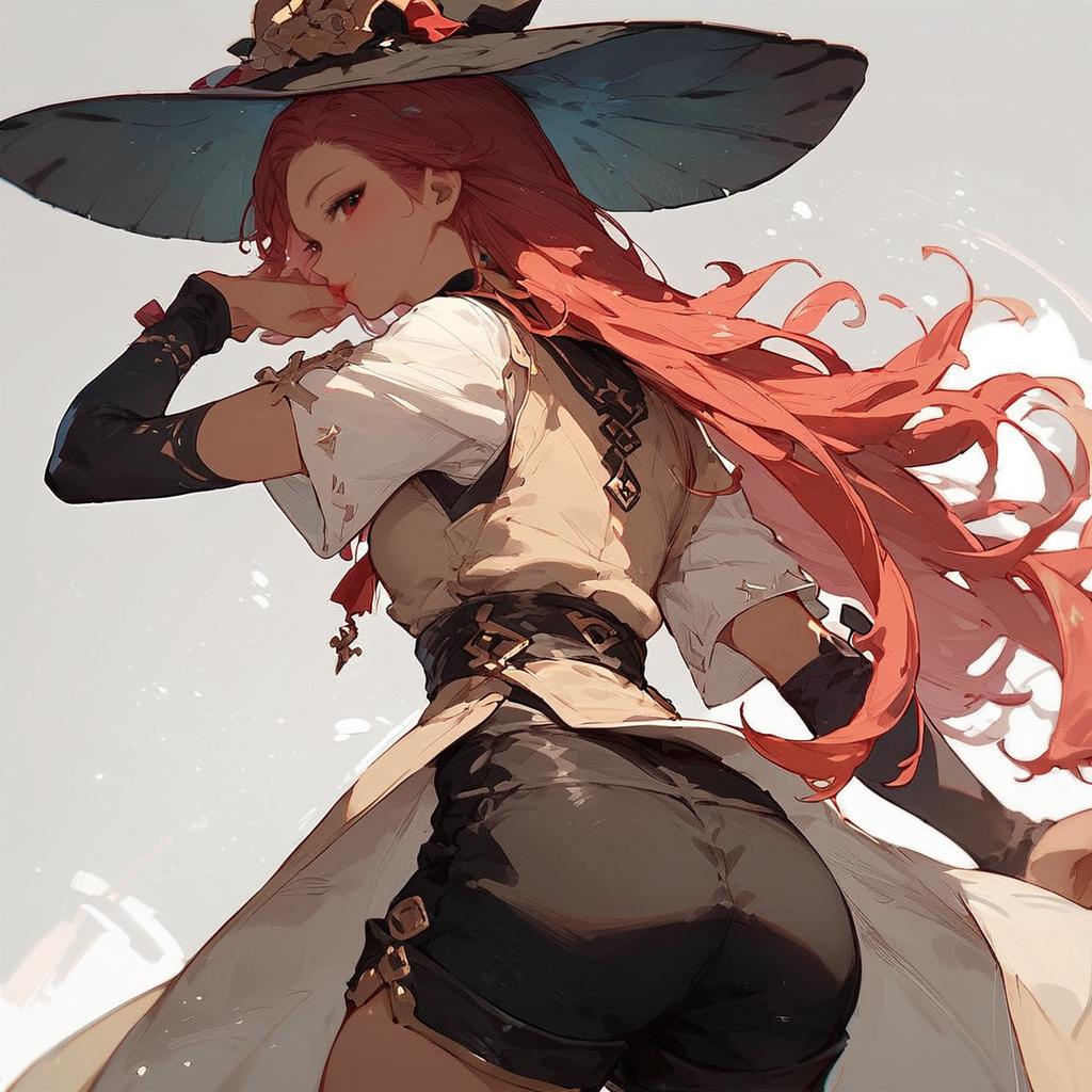 Digital anime-style drawing of a red-haired witch with flowing hair, large blue hat, white top, black shorts, and gloves, looking back provocatively
