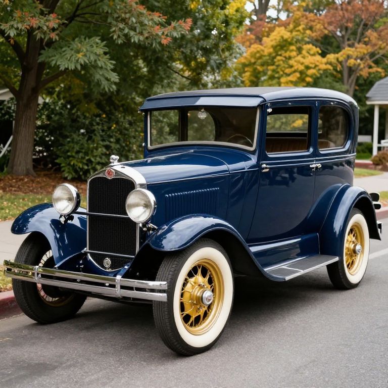 Photograph of a polished, dark blue vintage sedan with golden wire-spoked wheels and white-wall tires, parked on a suburban street. The car features a classic grille, round headlights, chrome accents, and a badge on the hood. The background includes lush green and yellow-leaved trees, a red curb, and a glimpse of a white building. The car's glossy finish reflects its surroundings, emphasizing its well-maintained condition and elegant design from the early 20th century. The image has a bright, daylight setting with crisp, clear details.