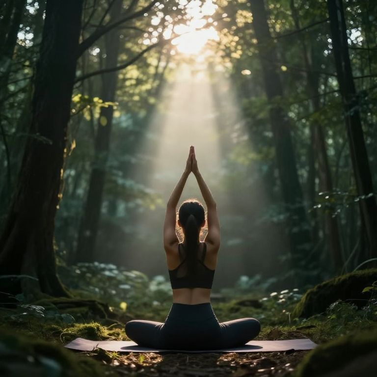 Photograph of a serene forest meditation circle: nine people sit on purple mats by a stream, surrounded by glowing candles and a glowing ethereal figure,