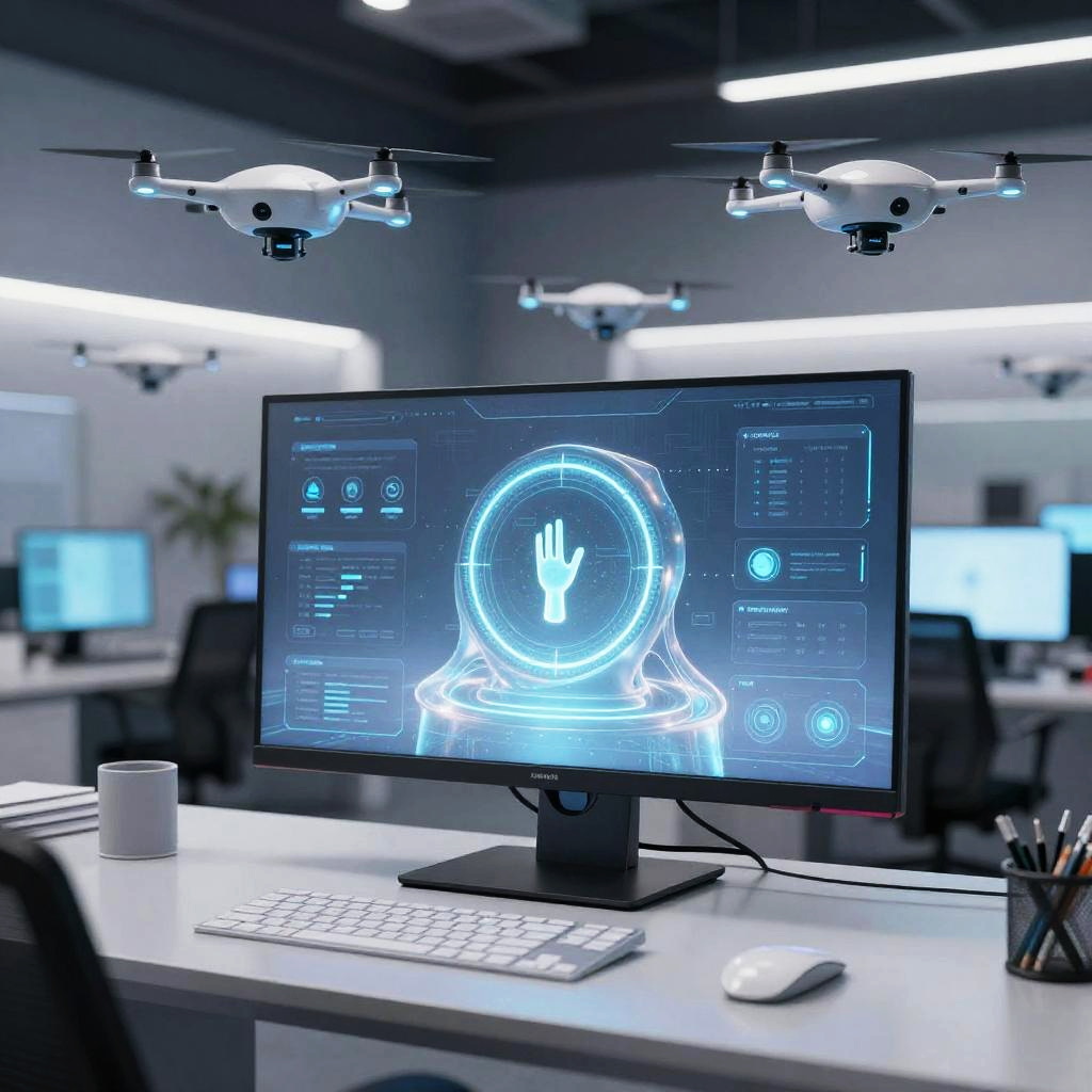 Futuristic PC with organic curved design, illuminated translucent elements, built-in voice and gesture control interfaces, surrounded by flying drones in a modern digital workspace