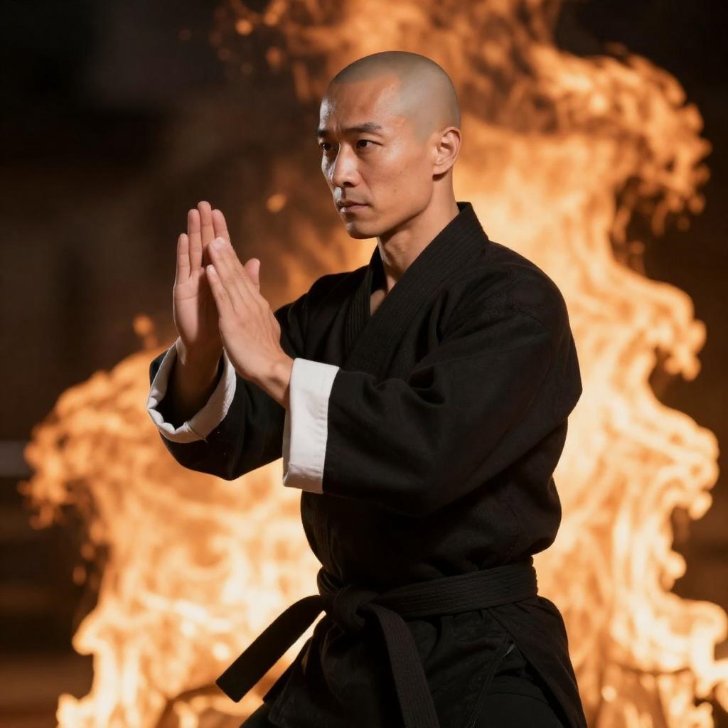 Photograph of three martial artists. Foreground: bald Asian man, intense expression, black jacket, right hand glowing with electricity, pointing forward. Background: Asian man in straw hat, relaxed, left hand on sword hilt. Right: Asian woman, intense expression, black clothing, holding sword. Cracked concrete wall with gears.