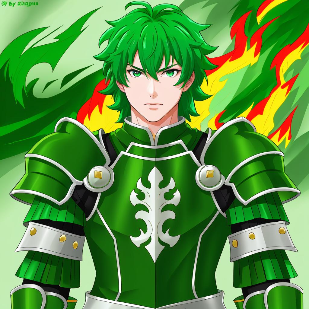 Digital anime-style illustration of a young male warrior with green hair and green eyes wearing ornate green and silver armor with gloves. The character stands confidently against a dynamic background featuring stylized green and fiery red-yellow flames.