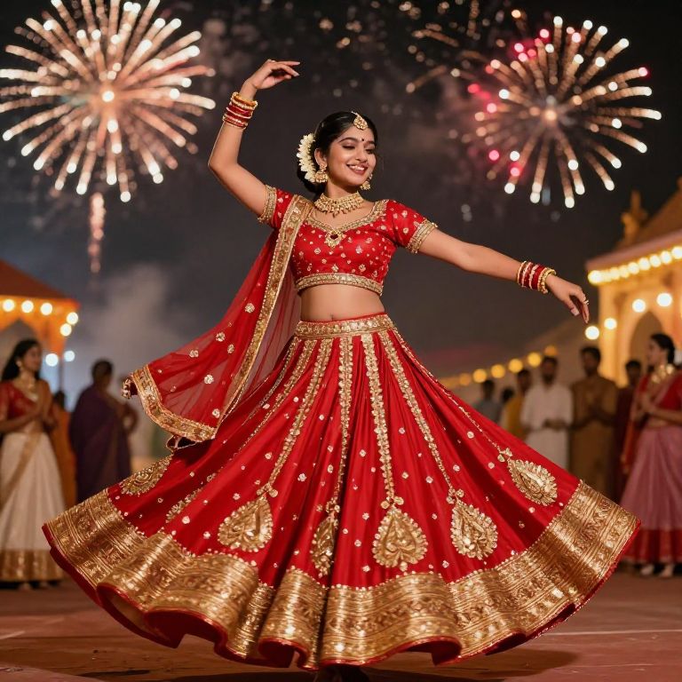An Indian girl dancing in a traditional festival setting, wearing a vibrant red and gold lehenga, joyous expressions, vibrant fireworks in the background, festive atmosphere, detailed clothing, dynamic pose, culturally authentic.