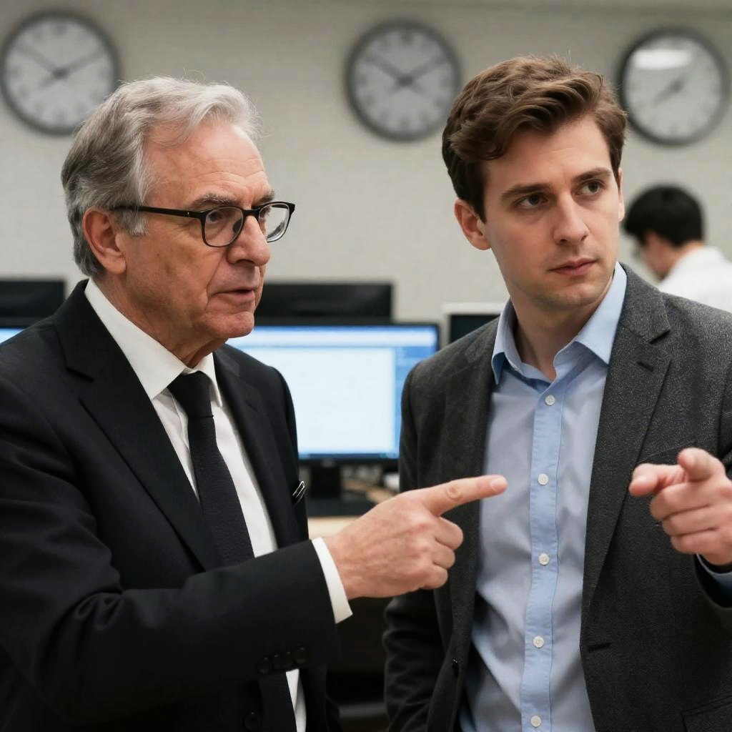 Middle-aged man with gray hair and glasses, wearing a dark suit, red tie, and white shirt, talking on a black corded phone. Background includes a blurred painting, door, and lamp. Intense expression. Seated in a leather chair.