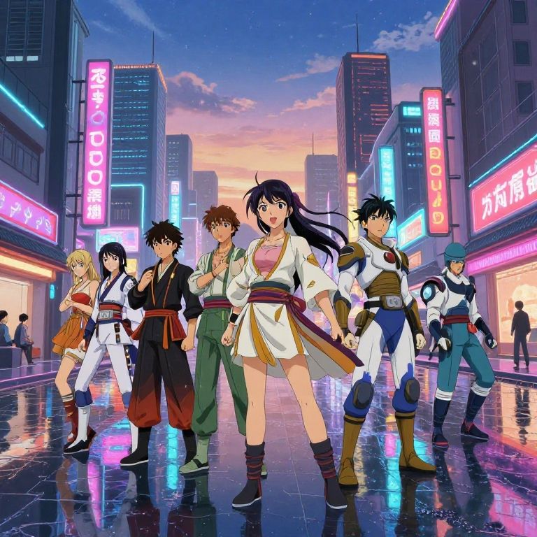 Anime-style digital illustration of six martial artists standing in a neon-lit, rainy city street at sunset, with tall buildings and vibrant signs in the background