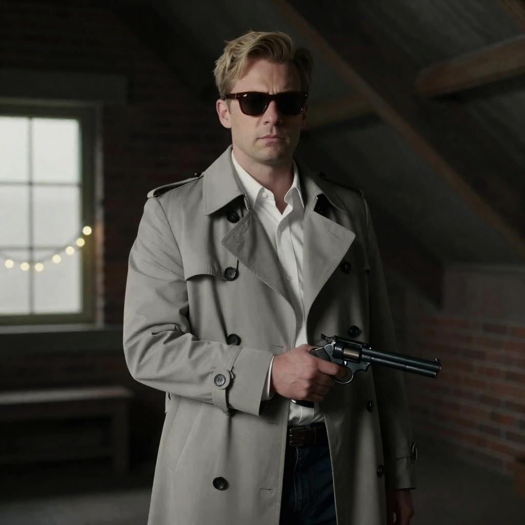 Photograph of a man with short blonde hair, wearing dark sunglasses, a light grey trench coat, and a white shirt, holding a black revolver in his right hand. He stands in a dimly lit, brick-walled attic with a slanted roof and a window with a string of small lights in the background. His facial expression is serious and determined.