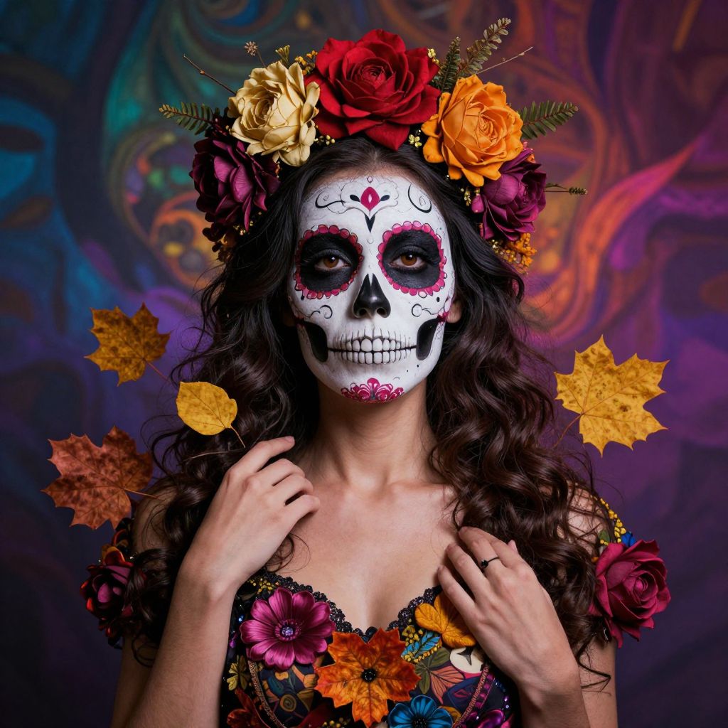 Photograph of a woman with long, curly brown hair adorned with a vibrant, floral headpiece featuring red, yellow, and orange roses. She wears a white sugar skull face mask with pink and black intricate designs. Her hands, with red-painted nails, are gently touching her shoulders. She wears a colorful dress with floral patterns. The background is a swirling mix of purple, blue, and orange hues. Yellow and orange autumn leaves float around her, enhancing the festive, Day of the Dead theme. The image is rich in color and detail, highlighting the cultural celebration.
