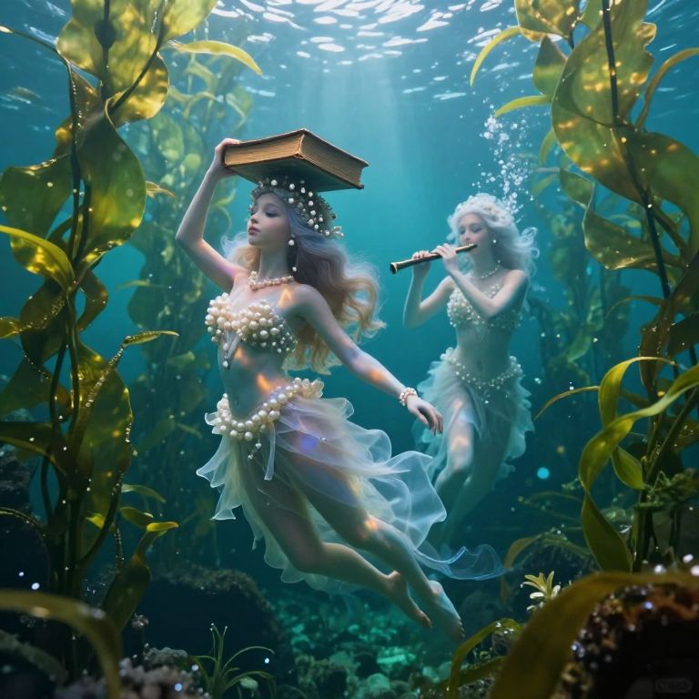 Imagine an enchanting underwater realm where ethereal beings gracefully navigate through verdant kelp forests in a style reminiscent of magical realism. One of these creatures, adorned with luminous pearl accessories, carefully carries an antique tome upon her head as another serenades the surroundings with a haunting melody from a seashell flute. The water shimmers with iridescent colors, casting mesmerizing patterns on their glistening forms as they harmoniously dance with the flowing currents. This captivating scene should evoke feelings of wonder and tranquility, beckoning viewers into an alluring world where fantasy seamlessly merges with nature's beauty.