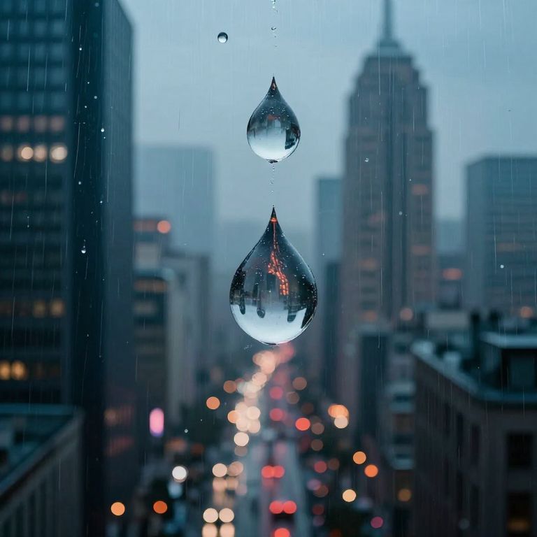 In a surreal cityscape where gravity defies convention, raindrops ascend to form luminous orbs, each a mirror to alternate realities, casting a melancholic yet hopeful reflection of existence amidst the urban symphony of lights and whispers.