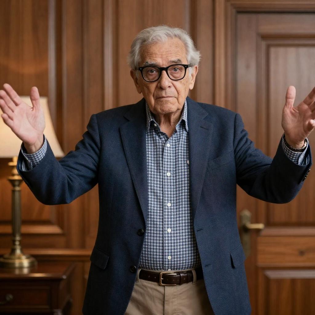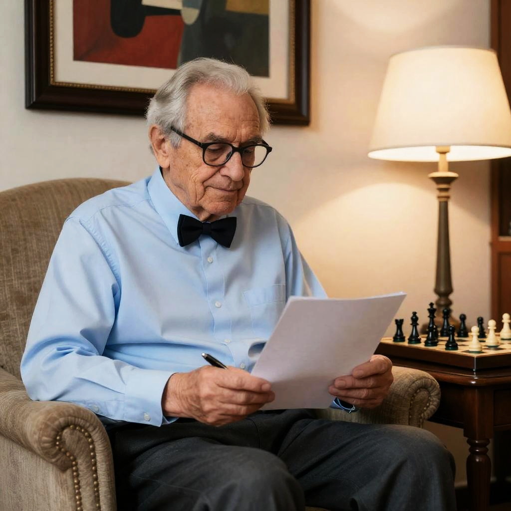 Old man with gray hair and glasses, wearing a light blue shirt and black bowtie, sits in an upholstered armchair. He holds a sheet of paper in his right hand and a pen in his left. A table lamp with a beige shade and a chess set sit on a wooden side table to his right. A framed abstract painting with red and black colors hangs on the wall behind him. He looks down at the paper with a slight smile.