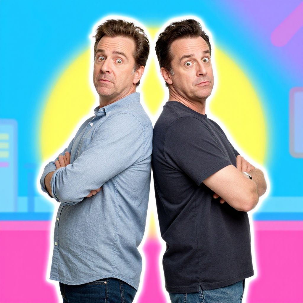 Step brothers photo template featuring two quirky middle-aged men in casual attire, standing back to back with humorous expressions, vibrant background with playful elements, designed for a fun and lighthearted photo composition.