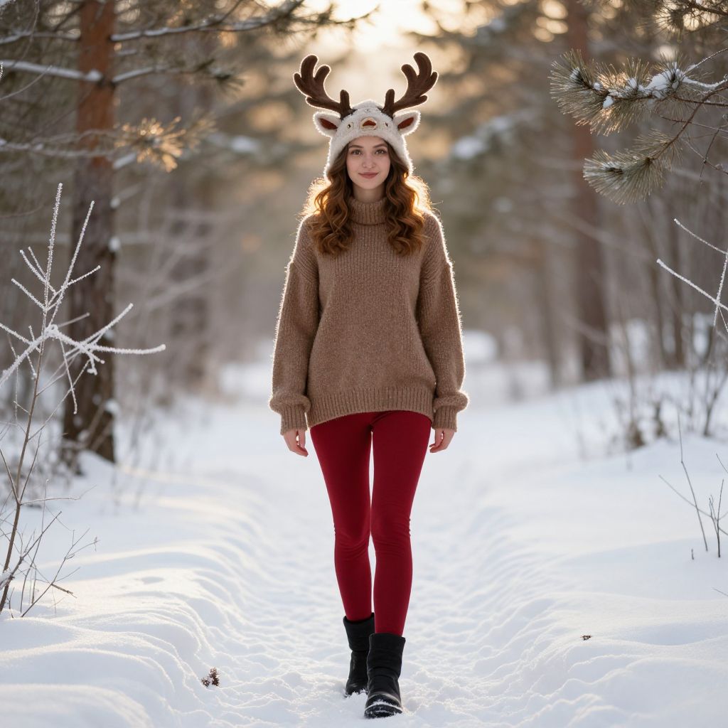A beautiful young woman with warm brown eyes and soft, wavy chestnut hair, wearing a traditional reindeer antler hat, a cozy brown wool sweater, bright red leggings, and sleek black boots. She stands confidently in a snowy forest clearing, the golden morning light filtering through the trees, with a gentle smile and a sense of calm and adventure. The scene is serene and winter-themed, with pine trees and frosty branches in the background.