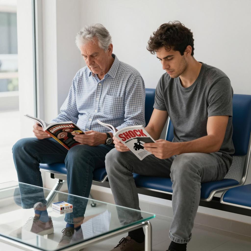 Two men sitting on blue chairs in a waiting room. The older man with gray hair, wearing a checkered shirt, reads a magazine. The younger man with dark hair, wearing a gray shirt, holds a magazine with "SHOCK" on the cover. Glass coffee table with a cigarette pack in front. Bright window on the left.