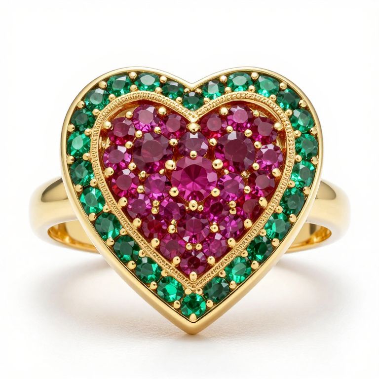 Sacred Heart Ring in Micro Mosaic showcases a vibrant design featuring a central red heart encrusted with numerous ruby-like stones, surrounded by an intricate border of emerald-green and gold accents, all set against a polished golden band.