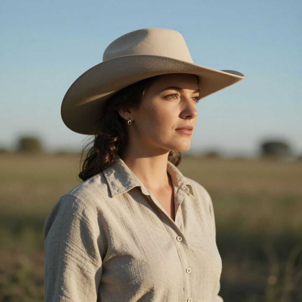 Amidst a serene pastoral backdrop, a vintage Texan portrait captures the quiet strength and introspective grace of a woman in timeless elegance, her wide-brimmed hat casting a shadow of contemplation over her poised visage, evoking a sense of enduring freedom and solitude.