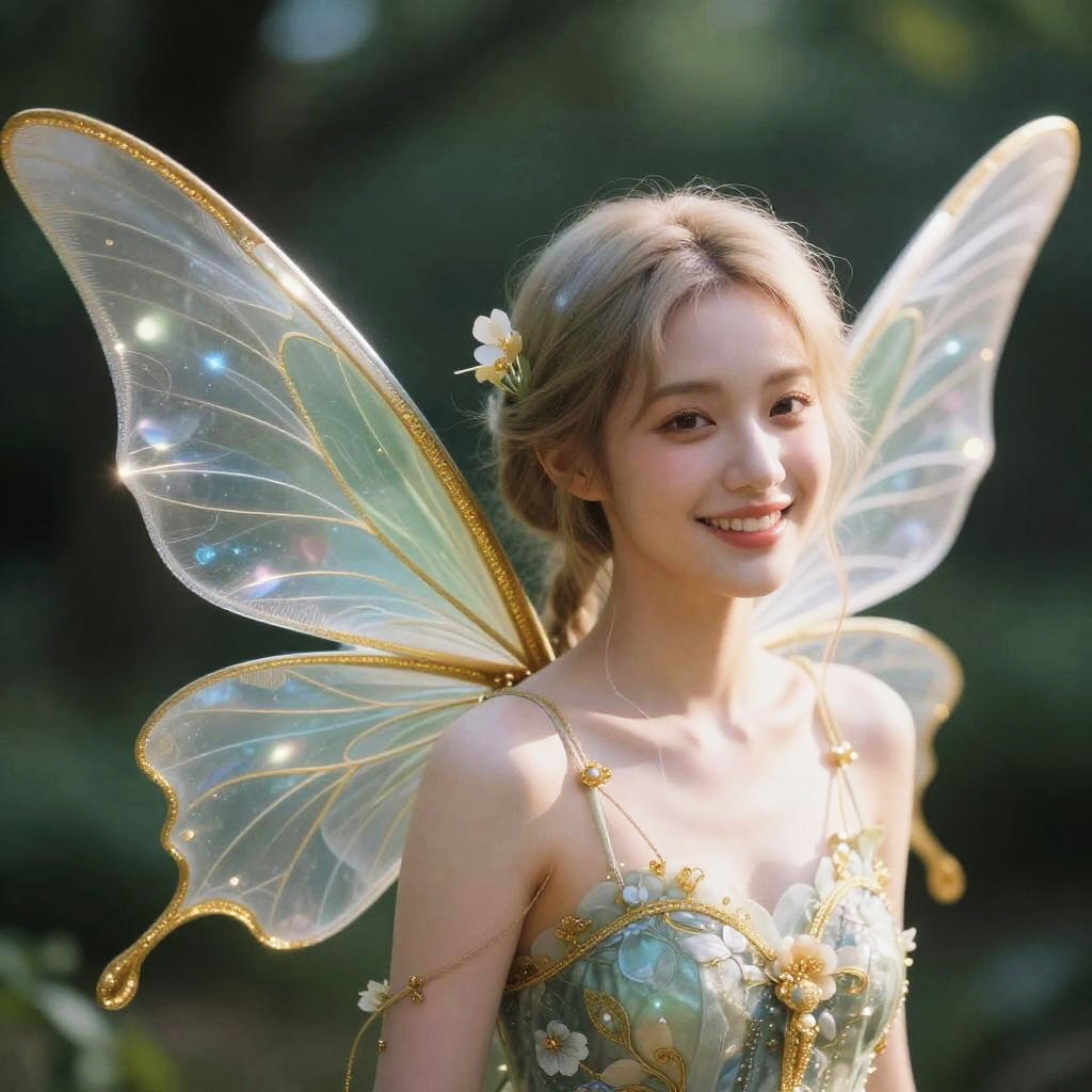Realistic photo.Portrait of a charming fairy, with delicate wings, intricate gold linings, and a captivating smile, inspired by Minjae Lee, Carne Griffiths, and Emily Kell, featuring enchanting floral patterns, magical light effects, deeply detailed and balanced with double exposure, photorealism, and ultra-realistic textures in an upper-body shot (facing viewer). realistic photo