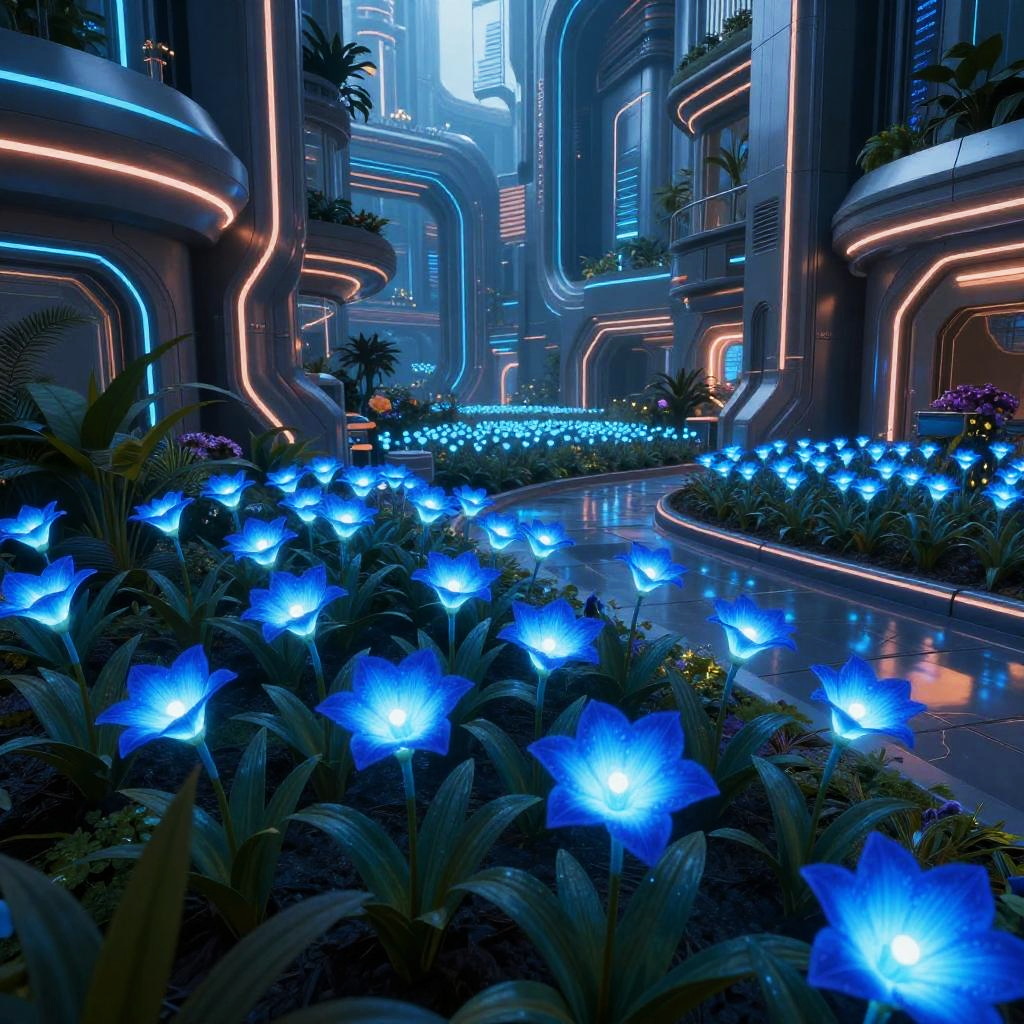Blue glowing flowers bursting with neon light in a futuristic cyber garden, contrasting with sleek metallic structures, vibrant colors, sci-fi scene