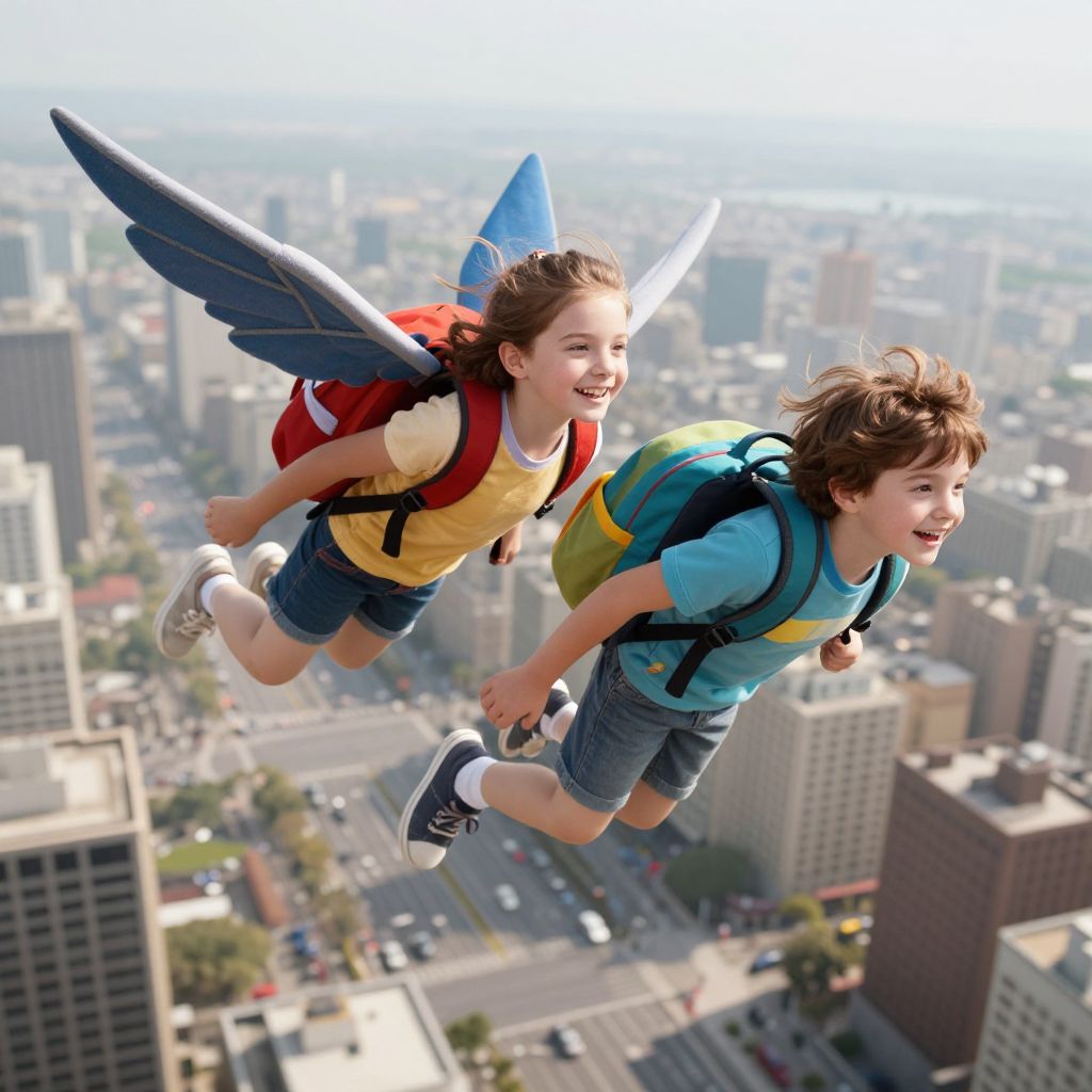 Two children soar gracefully above a bustling cityscape, their bodies adorned with vibrant, winged backpacks that defy gravity, as they glide effortlessly through the air with smiles of wonder.