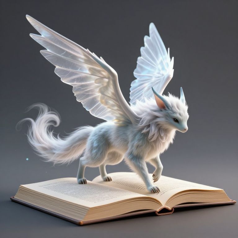 A 3D-rendered fantasy creature with translucent wings and flowing fur emerges from an open book, embodying the evolution of literature into living, ethereal beings that traverse the realms of imagination.