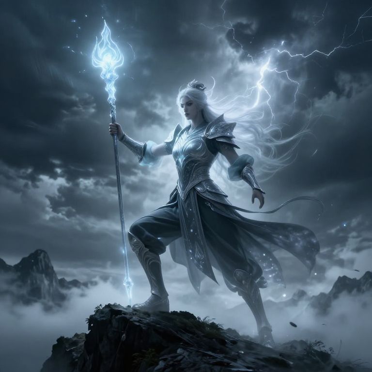 DND female wizard art, mesmerizing enchantress with silver hair and piercing eyes, harnessing lightning magic, standing atop a mountain peak at sunset, flowing cape and magical aura surrounding her, highly dynamic and detailed fantasy artwork