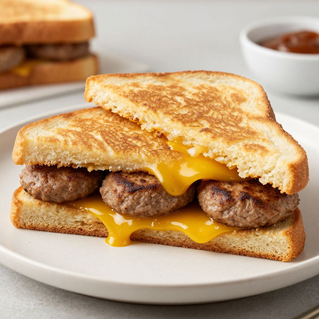 Photograph of a grilled cheeseburger sandwich on a white plate. The sandwich features two golden-brown toasted slices of bread with a thick, juicy beef patty in the middle. Melted yellow cheese oozes out from between the bread slices. The background shows a wooden table and a slightly blurred glass of milk. The image is brightly lit, highlighting the texture of the bread and the cheese's gooeyness. The overall style is clean and appetizing, focusing on the sandwich as the main subject.