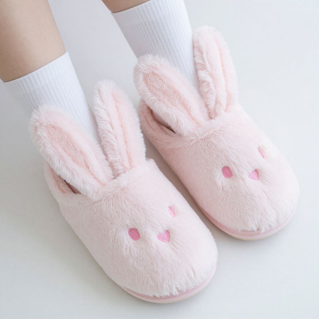 Photograph of a person's lower legs wearing fluffy, pink bunny slippers with black eyes and small pink noses. The slippers have soft, white fur and long, floppy ears. The person's skin is fair and smooth, and the background is a plain, light-colored floor. The image is brightly lit, emphasizing the plush texture of the slippers. The focus is on the feet, with the legs slightly bent at the knees, and no other objects or people are visible in the frame.