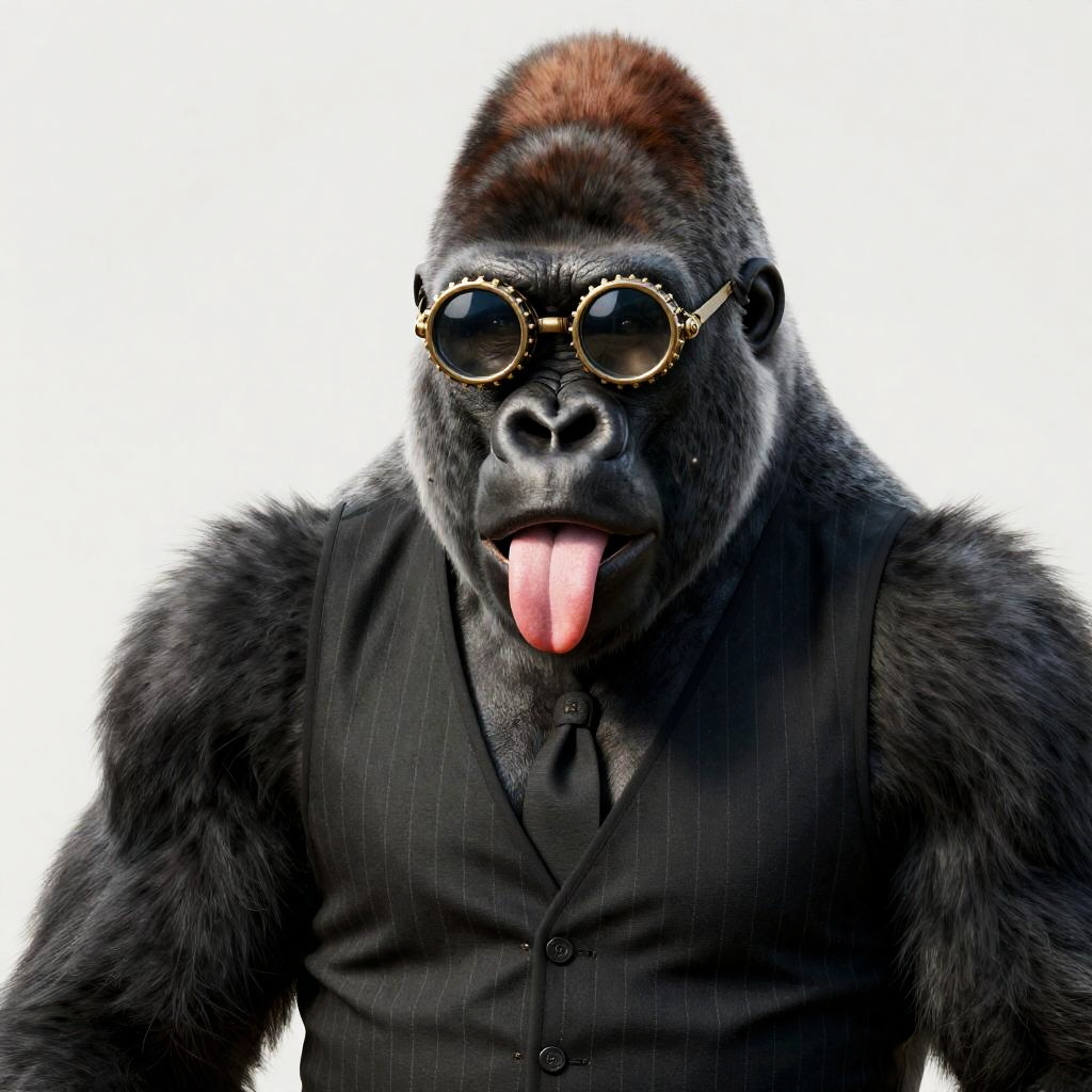 A stunningly realistic digital artwork depicting a silverback gorilla sporting steampunk monocle and a tailored pinstripe waistcoat. Its tongue is playfully sticking out, and this ultra-detailed piece boasts a 4K resolution, currently trending on various art platforms, showcasing exquisite details and a cutting-edge aesthetic.