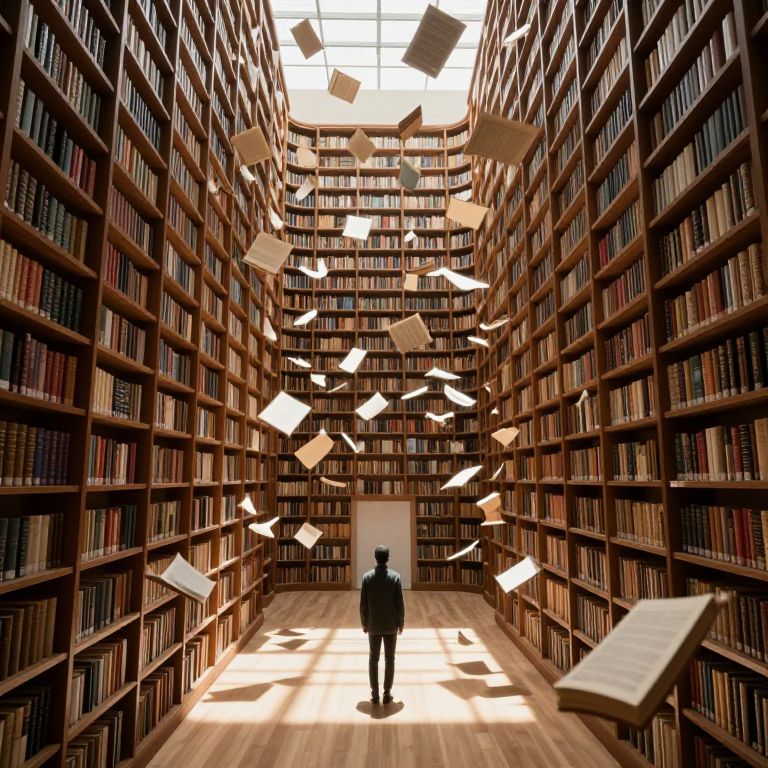 In a surreal, high-definition digital rendering, a solitary figure stands amidst towering bookshelves in a vast library, as pages flutter and float in midair, creating a mesmerizing interplay of light and shadow that transforms the space into a dynamic, three-dimensional tapestry of stories.
