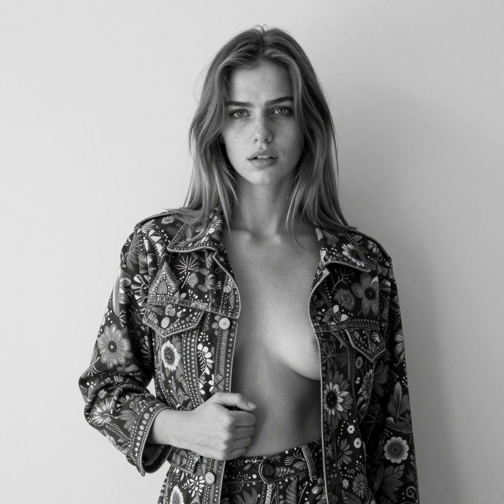 Black and white photo of a blonde woman sitting on a concrete ground against a plain wall. She is crouched with knees up, head resting on her arms, wearing a long-sleeve top and high-heeled boots with a crocodile pattern. Her long hair falls over her face, partially obscuring it. She wears a ring on her right hand. The ground is dark, and the wall is light. She has a contemplative expression.