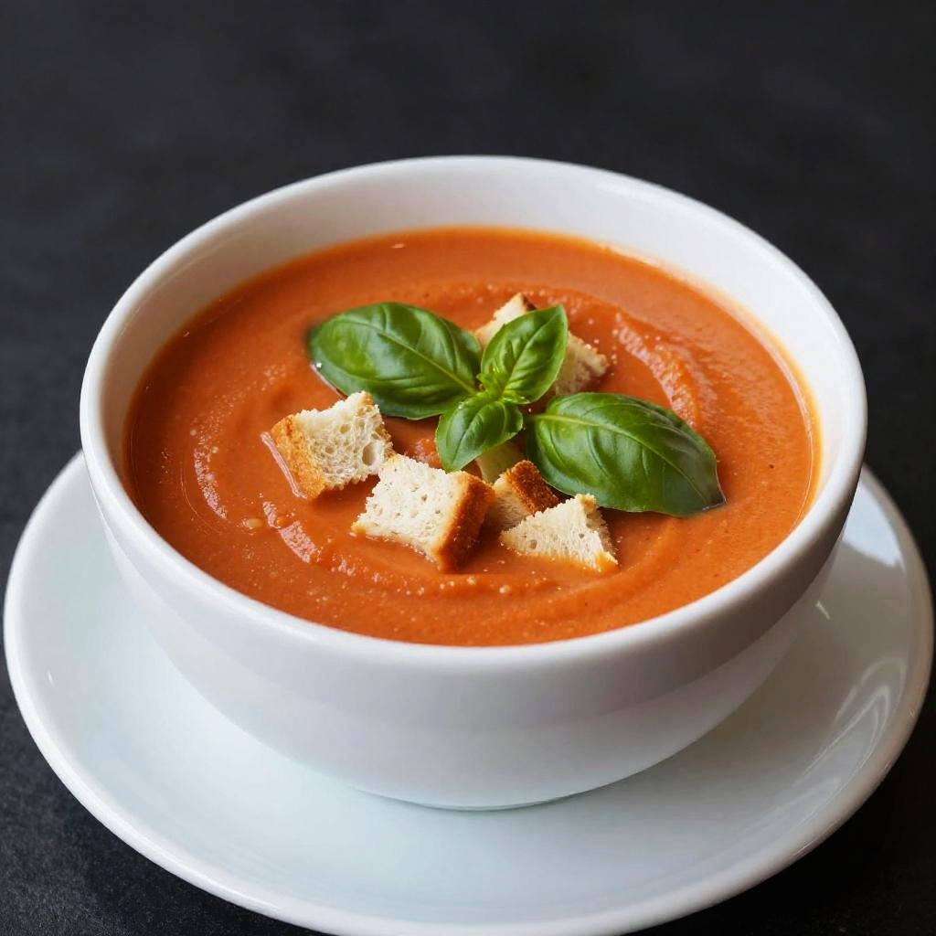 Photograph of a bowl of tomato soup on a white saucer. The soup is a vibrant orange-red, topped with chunks of white bread and a sprig of fresh green basil. The bowl is white and contrasts against a dark, glossy background. The soup looks creamy with a smooth texture, and the bread pieces are slightly crouton-like.