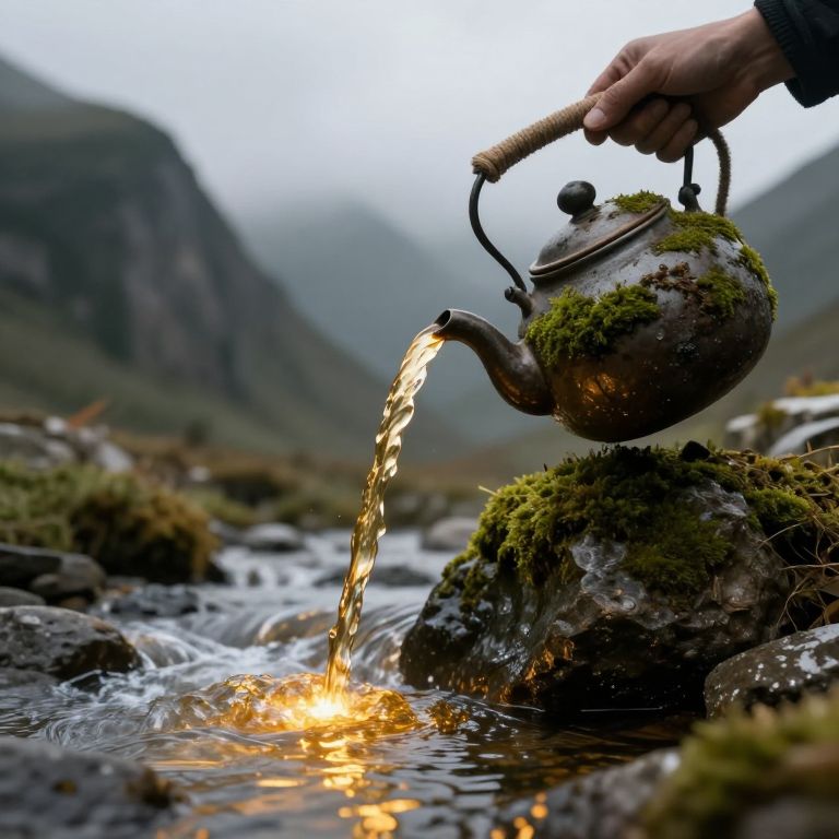 An ancient, moss-covered teapot, perched atop a mountain peak, pours a continuous stream of glowing tea into a flowing river of liquid gold.