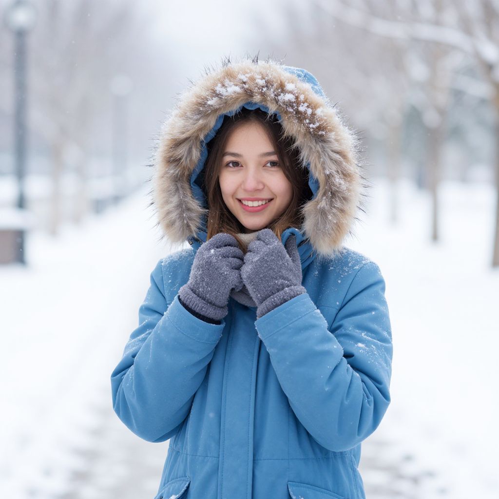 A young woman wearing a blue winter coat with a fur-lined hood smiles warmly as snow falls around her. She is standing outdoors on a snowy pathway, dressed in cozy gloves, capturing the serene and joyful essence of a winter day.