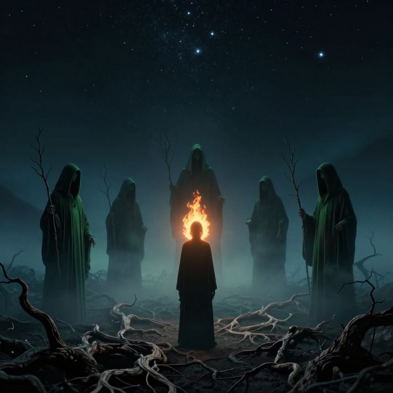The image depicts a surreal, dark landscape under a starry night sky. In the foreground, a solitary figure stands with a glowing, fiery halo, surrounded by six ghostly, hooded figures. These spectral beings are arrayed in a semi-circle, each holding a branch or staff. The scene is shrouded in mist, adding to the eerie atmosphere. The ground is covered in twisted, gnarled roots, and the overall color palette is dominated by dark blues and greens, with the fiery halo providing a stark contrast. The composition is balanced, with the figure and ghostly figures evenly distributed across the frame, creating a sense of symmetry and tension. The stars in the sky are scattered, adding depth and a sense of vastness to the scene. The interplay of light and shadow, along with the intricate details of the roots and mist, contribute to the overall sense of mystery and otherworldliness.