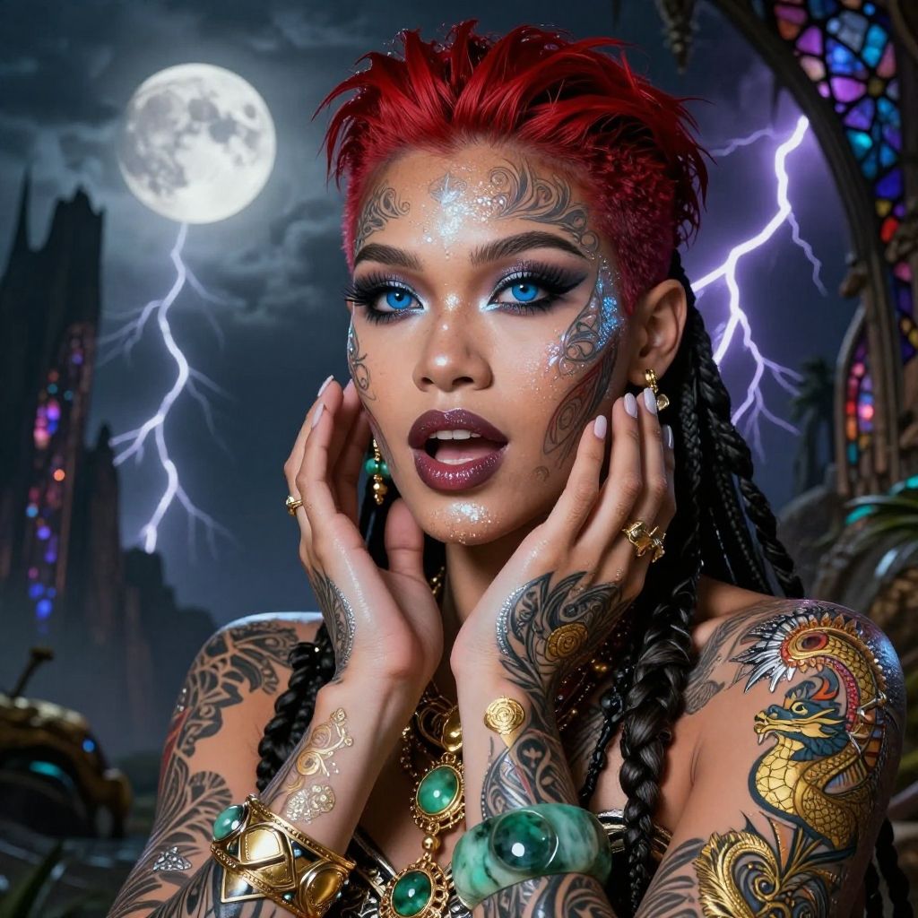 This is a digital fantasy portrait of a heavily tattooed woman with bright red, spiky hair and striking blue glowing eyes. Her skin is adorned with intricate black and gold tattoos, and she wears dark purple lipstick. She has her hands raised to her face, displaying detailed jewelry including green gemstones and gold rings. The background features a dark, stormy night sky with a full moon and bright lightning bolts, set against a Gothic, cathedral-like structure with colorful stained glass windows. Her expression is one of surprise or enchantment. The image has a highly stylized, surreal quality, combining elements of cyberpunk and fantasy art.