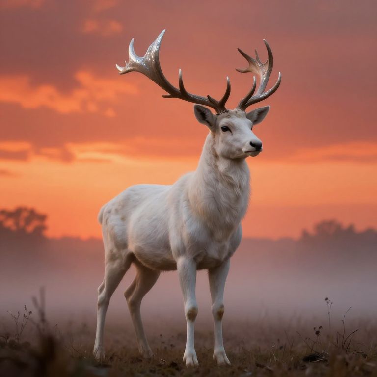 A majestic digital art portrait showcases a mythical white stag with shimmering antlers standing in an enigmatic misty field at dawn. The fiery hues of orange and red paint the dramatic sky, contrasting the ethereal atmosphere created by the fog. This unique perspective reveals the creature from below, its powerful legs emerging from the hazy ground as if rising from a dream or distant memory, inviting viewers to ponder the untold stories behind this enigmatic presence in our world.