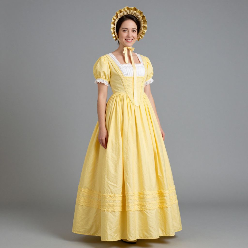 Yellow Colonial Dress, woman in a yellow dress and a gold bonnet