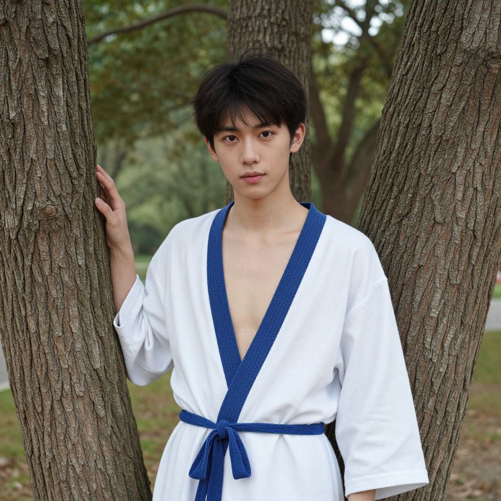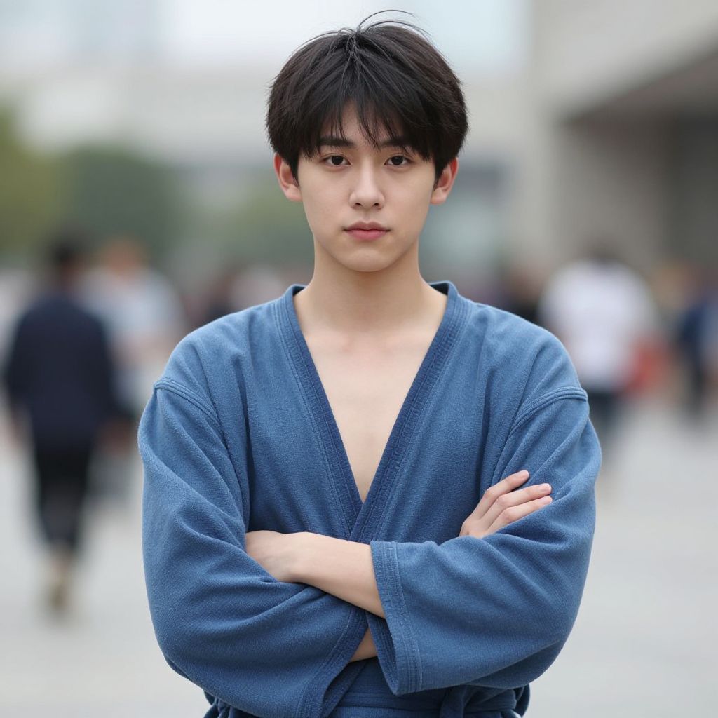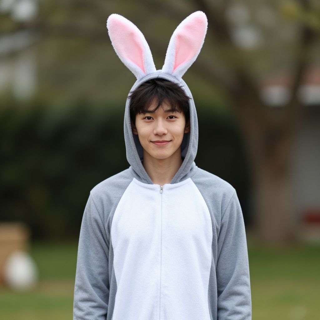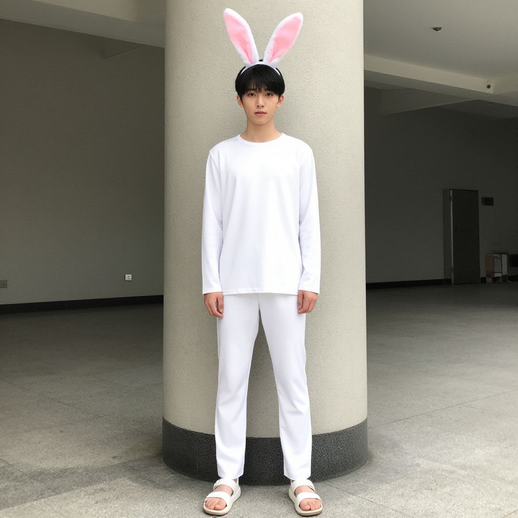 "alala costume, 1boy, solo, male focus, standing, animal ears, closed mouth, pillar, full body, long sleeves, sandals, rabbit ears Realistic photo of casual sexy person with pretty face"