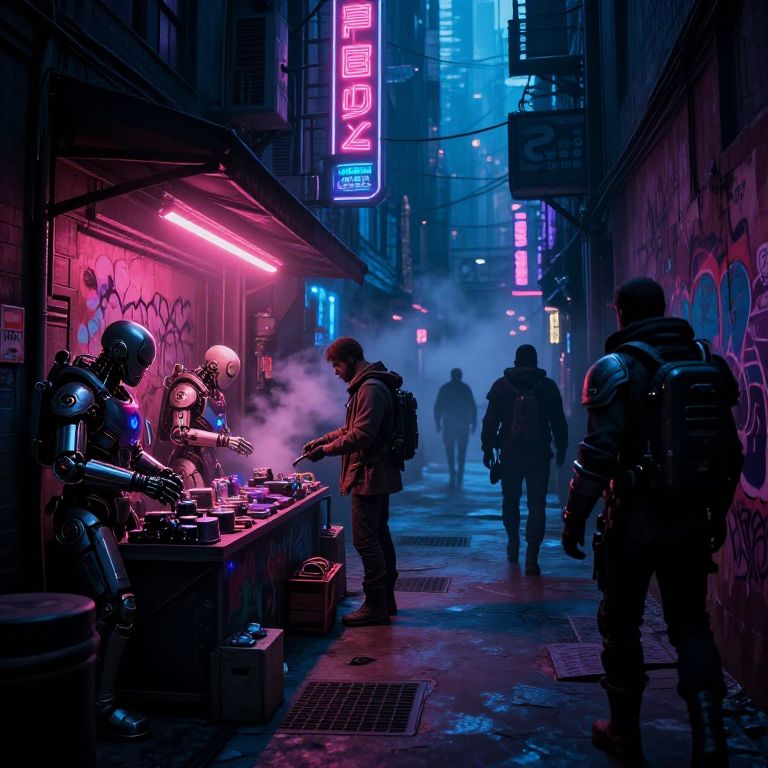 Cyberpunk city art illustrating a dark alley bathed in colorful neon glows, with cybernetic vendors selling gadgets, graffiti-covered walls, steam rising from grates, and shadowy figures wearing high-tech gear, embodying the gritty and immersive atmosphere of a futuristic city.