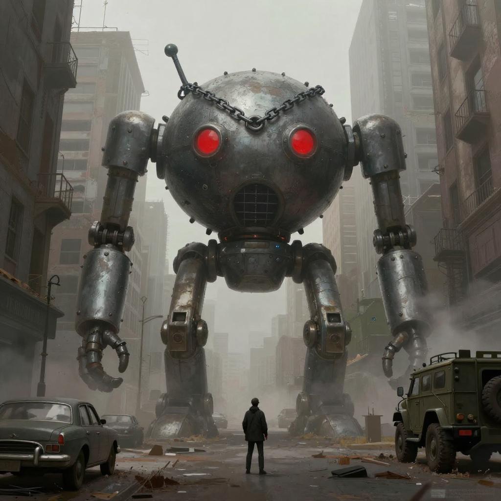 Gritty Robot Guardian in Dystopia