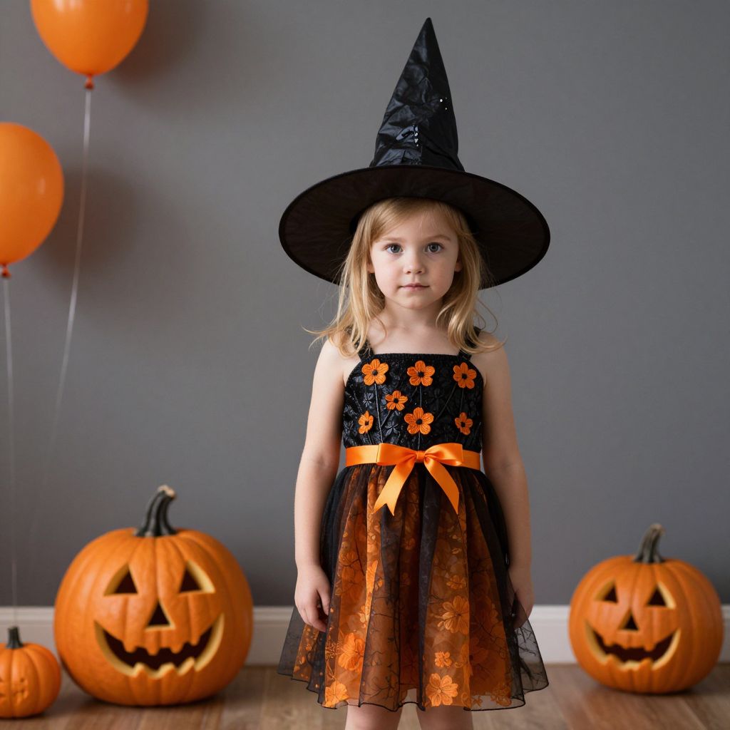 Crafty little witch toddler, hat, witch hat, solo, 1girl, halloween, jack-o'-lantern, pumpkin, witch, looking at viewer, standing, indoors, dress, flower, blonde hair