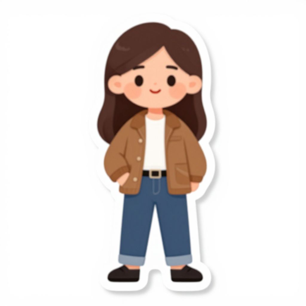 A cute die-cut sticker of a Chinese woman with long brown hair, wearing a brown jacket over a white shirt and jeans, standing with hands in pockets, on a white background.