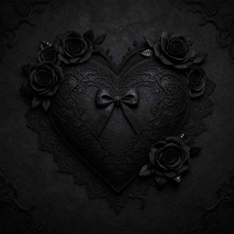 Black aesthetic heart wallpaper with a gothic vibe, displaying intricate heart motifs entwined with delicate lace patterns and dark roses, all rendered in rich black tones with occasional silver highlights.