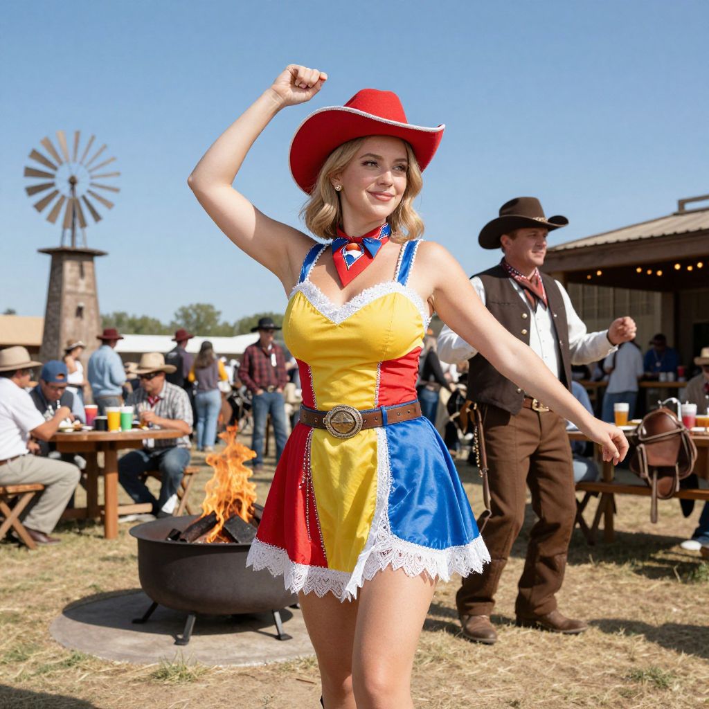 Photograph of a fair with a blonde woman in a vibrant, yellow, blue, and red cowgirl outfit with white lace trim, a red cowboy hat, and a blue neckerchief. She has a cheerful expression, her right arm raised, and is walking in front of a rustic, outdoor setting. In the background, a man in a brown vest and cowboy hat stands near a wooden building, and a group of people sit at tables. A metal windmill and a fire pit with flames are visible, under a clear blue sky. The scene exudes a lively, western-themed atmosphere.